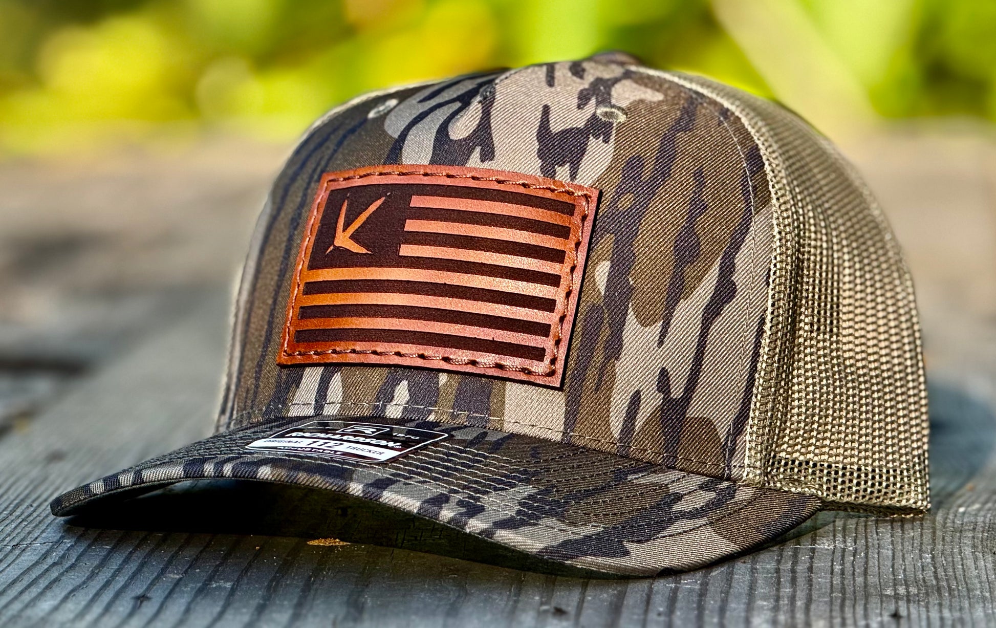 Introducing our Turkey American Flag Leather Patch Hat. Made with high-quality leather and featuring a proud Turkey hunting design, this hat is a true luxury for those who appreciate the sport. Show your love for both Turkey hunting and the USA with this stylish Richardson 112 hat.